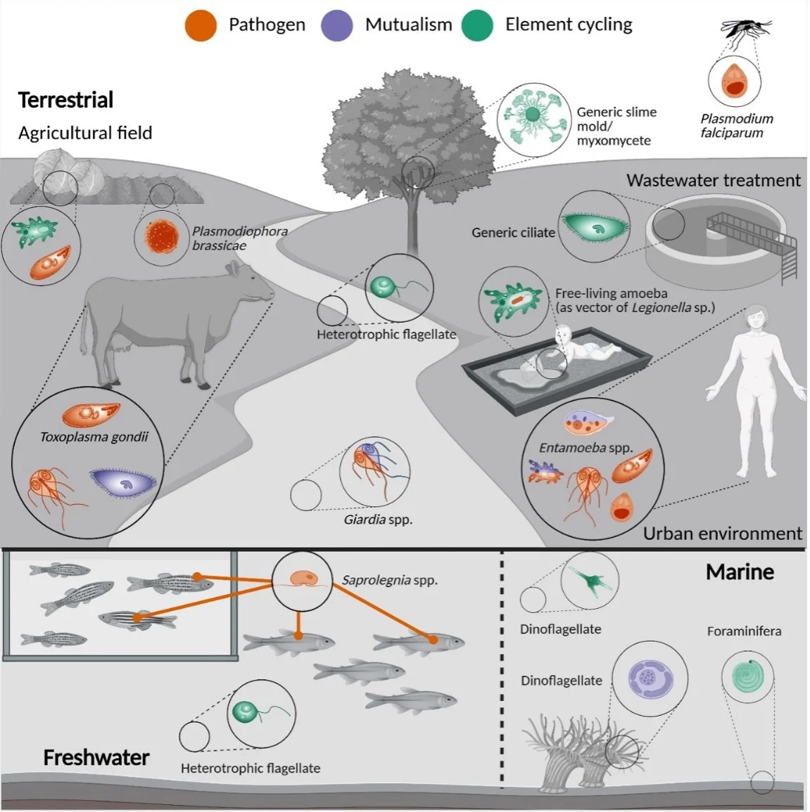 “Visual representation of the different roles that protists play in One Health in terrestrial, freshwater, and marine ecosystems” (https://academic.oup.com/ismej/article/19/1/wraf179/8239679)