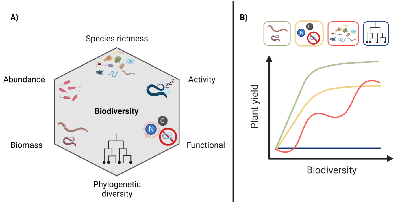 (a) Conceptual illustration of the different facets of soil biodiversity that underlie soil biodiversity and ecosystem functioning (sBEF). (b) Hypothetical representation of the sBEF link depending on the biodiversity facet considered. The icons on top are related to the functions depicted by having the same color and are the same as in (a), representing biomass, functional diversity, species richness, and phylogenetic diversity as four different biodiversity facets.