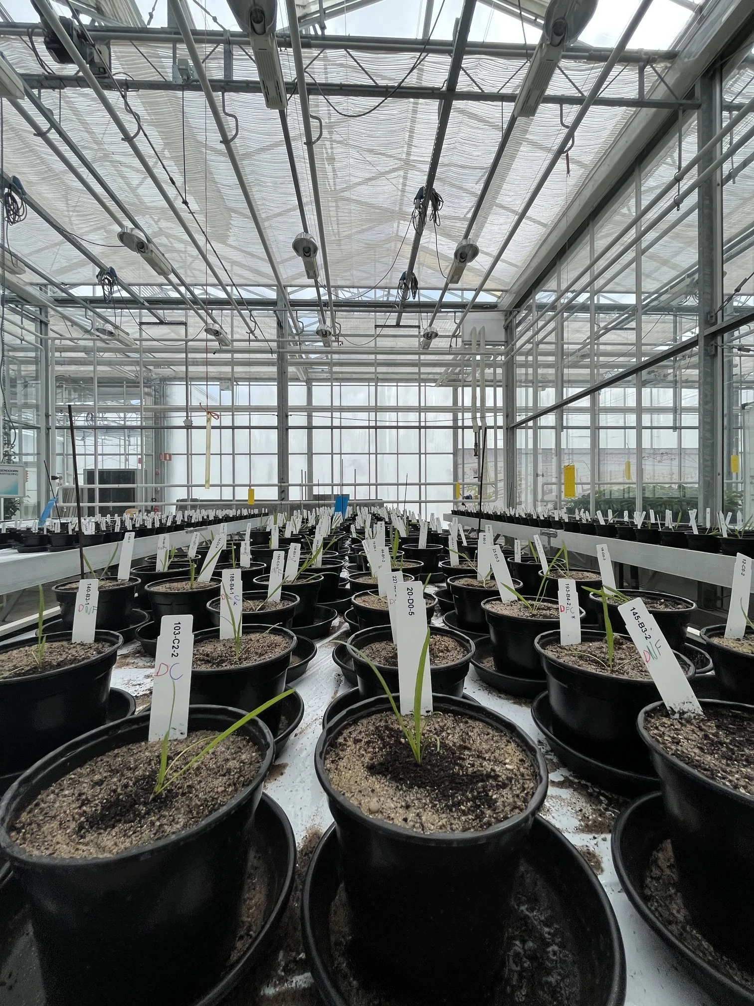Experimental setup in a greenhouse at Wageningen University. Here we were testing the effect of increasing soil microbiome predator diversity (protist and nematodes) on plant performance under the influence of interacting global change factors.