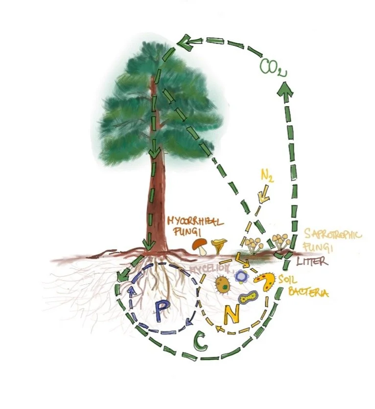 Illustration 2: Microbial communities regulate key soil processes, including the cycling of carbon, nitrogen, and phosphorus that sustain forest productivity.