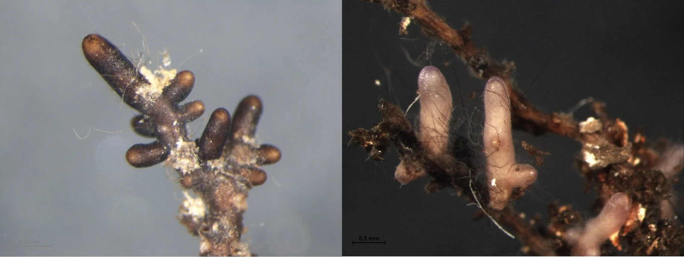 Photo 1: Mycorrhizal root tips. Humaria hemisphaerica (left) and Laccaria amethystina (right) from an oak forest in Slovenia. Photo credit: Tanja Mrak, Slovenian Forestry Institute